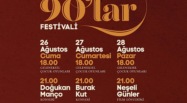 Büyükşehir Belediyesi tarafından Ağustos ayı boyunca sürdürülen Açık Hava Etkinlikleri 90’lar festivali ile devam edecek. 26-28 Ağustos tarihleri arasında 3 gün boyunca devam edecek programlarda, konserler, geleneksel çocuk oyunları ve film gösterileriyle kültür sanat dolu günler yaşanacak.