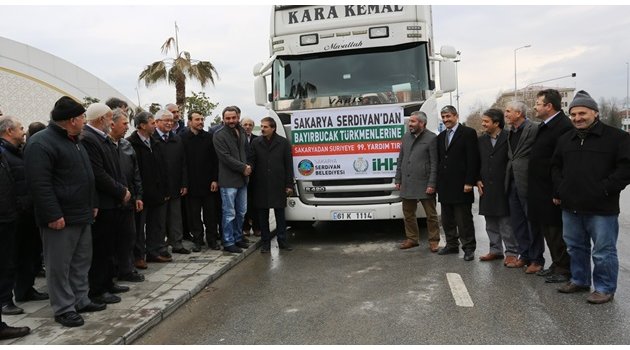 Bayırbucak Türkmenleri’ne ulaştırılmak üzere Sakarya’dan yola çıkan yardım tırlarının 99.su Serdivan’dan hareket etti.