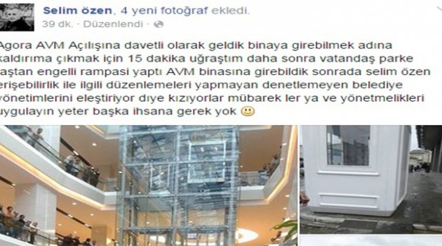 Yaşanan bu olay Sakarya Yenihayat Paralimpik Spor Kulübü Başkanı Selim Özen tarafından sosyal medyada eleştirildi.Özen, facebook hesabında başına gelen olayı şu cümlelerle anlattı:“15 DAKİKA UĞRAŞTIM”“Agora AVM açılışına davetli olarak geldik, binaya girebilmek adına kaldırıma çıkmak için 15 dakika uğraştım. Daha sonra vatandaş parke taştan engelli rampası yaptı, AVM binasına girebildik.“YASA VE YÖNETMELİKLERİ UYGULAYIN YETER”Sonra da “Selim Özen erişebilirlik ile ilgili düzenlemeleri yapmayan denetlemeyen belediye yönetimlerini eleştiriyor” diye kızıyorlar, mübarekler yasa ve yönetmelikleri uygulayın yeter, başka ihsana gerek yok”“ENGELLİ TUVALETİ VE BEBEK ODASI KAPILARI KAPALI”Öte yandan açılışı yapılan Agora AVM’de bebek odası ve engelli tuvaletinin kapılarının kapalı olmasını da eleştiren Selim Özen, tuvalet kapısı önünde çektirdiği fotoğraf karelerini de sosyal medya hesabında yayınladı. Özen fotoğraflar üzerine “Bebek odası ve engelli tuvaleti halen açılmadı, sanırım açılış için bekleniyor, o yüzden kapalı tutuluyor. Agora AVM Engelli tuvaleti kapalı 15 dakikadır açılmasını bekliyoruz. Neden yapıldıysa artık” diye yazdı.