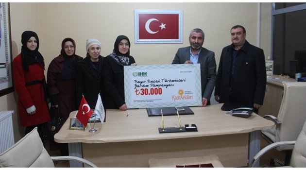 Bayır-Bucak Türkmenlerine yönelik başlayan kampanya yoğun bir hızla devam ediyor. Sakarya İHH’nın başlatmış olduğu Bayır-Bucak Türkmenlerine yönelik yardım kampanyasına katılan AK Parti Sakarya İl Kadın Kolları tarafından toplanan 30 Bin TL para Sakarya İHH’ya teslim edildi. Gerçekleşen yardımda konuşan AK Parti Sakarya İl Kadın Kolları Başkanı Zehra Hatipoğlu, Suriye de beş yıldır bir insanlık dramı yaşandığını son günlerde ise Bayır-Bucak Türkmenlerine yönelik saldırıların yoğunlaştığını belirtti.