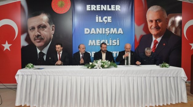 “Erenlere güveniyorum”Şehircilik ve Belediyecilik ile alakalı Cumhurbaşkanı ve Başbakanın katılımları ile Cumhurbaşkanlığı külliyesinde gerçekleştirilen Şehircilik Şurası programından gelerek Danışma Meclisi toplantısına katılan Erenler Belediye Başkanı Cavit Öztürk, “Kentsel Dönüşüm Projesinde ilk etabın bittiğini ikinci etapta ise 144 konutluk inşaat çalışmalarının başladığını belirtti. Bin yataklı hastane ve İkinci Üniversite’nin Erenlere kazandırılması ile ilgili girişimlerinin devam ettiğini hatırlatan Başkan Öztürk “Diğer tavsiye edilen yerlere nazaran hastane Erenler’ de olacak gibi görünüyor” dedi. Referandum ile ilgili Genel Merkezin Sakarya’da koyduğu hedefin %75 olduğunu belirten Öztürk, Erenler’ in asgari %85 oy alması için tüm teşkilata ve Erenlere güvendiğini ifade etti. “Milletvekili Uncuoğlu Kentsel Dönüşümden övgü ile bahsetti”AK Parti Sakarya Milletvekili Recep Uncuoğlu konuşmasında “Belediye Başkanımız Cavit Öztürk Kentsel Dönüşüm sürecini Erenlerde çok iyi yönetti. Erenler Kentsel Dönüşüm Projesi Türkiye’ye örnek bir model oldu. Bir yatırım fırsatı olarak yatırımcıların bu fırsatı kaçıracağını zannetmiyorum. Belediye Başkanımız da bu konuda son derece araştırmacı ve girişken bir tavırla tüm ihtimalleri araştırıyor zorluyor ve birden çok çözümlü alternatifler üretmeye çalışıyor. Şehircilikte örnek gösterilebilecek yapılaşmanın bundan sonrada devam edeceğine inanıyoruz. Bu projenin sağlıklı bir şekilde nihayete ermesini sağlamak için bizde elimizden gelen desteği vereceğiz” dedi. Hastane konusunda Erenler Alancuma bölgesinin lokasyon olarak iyi bir konumda olduğunu belirten Uncuoğlu, “Çalışmalar ve değerlendirmeler halen devam ediyor. Bin yataklı hastaneyi arazinin beğenilmesi ve Erenlere kazandırılması konusunda bizde destekliyoruz katkı sağlıyoruz” dedi. “Herkes sabırsızlıkla bende varım diyor”AK Parti Sakarya Milletvekili Recep Uncuoğlu referandum süreci ile ilgili de bilgiler verdi. Çok kapsamlı bir anayasa değişikliği için mecliste bir süreç yaşadık. Muhalefet artık çaresiz kalıp bunu engellemek için kürsü işgali, kendini mikrofona zincirleme, kabinlerden saatlerce çıkmama, oy vermeyi yavaşlatma gibi her şeyi yaptı. Biz ak parti Grubu olarak teknik ve taktik olarak hedefimizi belirlemiştik. Çok şükür fire vermeden Milliyetçi Hareket Partisinin de desteği ile bu çok önemli hükümet sistemindeki değişikliği içeren anayasa değişikliği meclisten geçti. Daha önceden birçok lider başkanlık sistemini dile getirmesine, istemesine rağmen bunu hayata geçiremedi. Anketler yapılıyor AK Partili birçok seçmen gönülden inanmış. Başkanlık sistemini davasının taçlanacağı bir nokta olarak görüyor. Özellikle Recep Tayyip Erdoğan’ın Cumhurbaşkanlığında bu sistemin çok daha mükemmel olacağına canı gönülden inanıyor. O yüzden herkes büyük bir sabırsızlıkla ben de varım diyor. İnşallah milletimizin EVET oyları ile bu süreci tamamlayacağız” dedi.