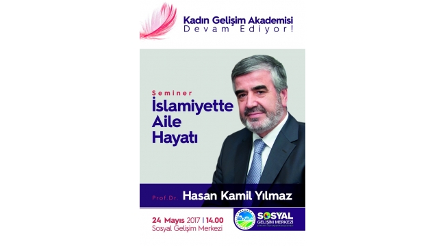 Sakarya Büyükşehir Belediyesi Sosyal Hizmetler Dairesi Başkanlığı tarafından başlatılan Kadın Gelişim Akademisi’nde eğitimler devam ediyor. Bu kapsamda 24 Mayıs Çarşamba günü Prof. Dr. Hasan Kamil Yılmaz, ‘İslamiyette Aile Hayatı’ başlıklı konusuyla Kadın Gelişim Akademisi’nin konuğu olacak. Sosyal Gelişim Merkezi’nde gerçekleştirilecek program saat 14.00’da başlayacak. Sosyal Hizmetler Dairesi Başkanlığı’ndan yapılan açıklamada, “Prof. Dr. Hasan Kamil Yılmaz’ın katılacağı ‘İslamiyette Aile Hayatı’ konulu programa tüm halkımız davetlidir” denildi.