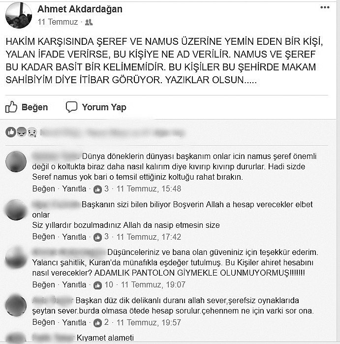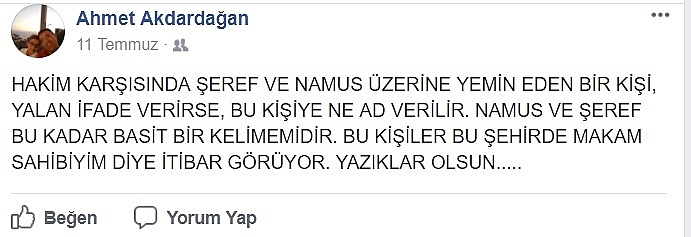 Bilindiği üzere Bakkallar Odası Başkanı Ahmet Akdardağan sakarya Esnaf Odaları Birliği yönetim kurulundaki görevinden istifa etmişti. Geçtiğimiz dönemde kamuoyunda bir çok kez gündeme gelen istifa sürecinde ortaya atılan bir çok iddia vardı. Daha sonra ise bu iddialar dava konusu olmuş ve konu yargıya taşınmıştı.Devam eden mahkeme ve içeriği ile ilgili henüz bir bilgi kamuoyu ile paylaşılmamışsa da Akdardağan’ın mahkeme süreci ile ilgili olduğu düşünülen sert paylaşımları dikkatlerden kaçmadı.ŞEREF VE NAMUS VURGUSU!Başkan Akdardağan Sosyal medya hesabından “HAKİM KARŞISINDA ŞEREF VE NAMUS ÜZERİNE YEMİN EDEN BİR KİŞİ, YALAN İFADE VERİRSE, BU KİŞİYE NE AD VERİLİR. NAMUS VE ŞEREF BU KADAR BASİT BİR KELİMEMİDİR. BU KİŞİLER BU ŞEHİRDE MAKAM SAHİBİYİM DİYE İTİBAR GÖRÜYOR. YAZIKLAR OLSUN.....” şeklinde bir açıklama yaptı.Yapılan paylaşımın altına bir çok yorumun yapıldığı görülürken bu sözlerin muhatabının kim olduğu ise merak uyandırdı.