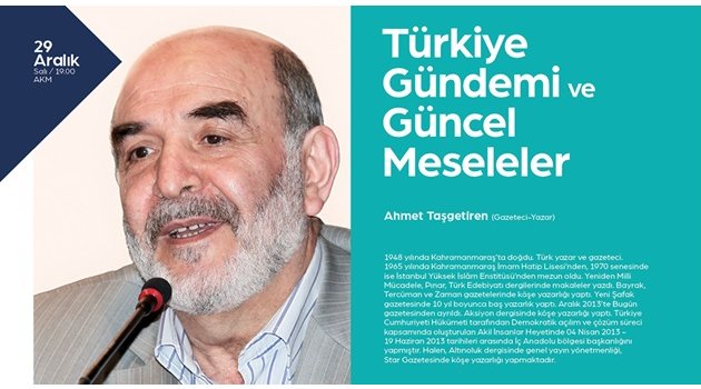 Sakarya Büyükşehir Belediyesi Kültür ve Sosyal İşler Dairesi Başkanlığı’ndan yapılan açıklamada, “Büyükşehir Aralık kültür sanat Etkinlikleri 29 Aralık Salı günü gerçekleştirilecek ‘Türkiye Gündemi ve Güncel Meseleler’ konulu konferans ile sona erecektir. AKM’de saat 19.00’da başlayacak yılın son programına Gazeteci-Yazar Ahmet Taşgetiren konuşmacı olarak katılacaktır. Konferansa tüm kültür sanat dostları davetlidir” ifadeleri kullanıldı.