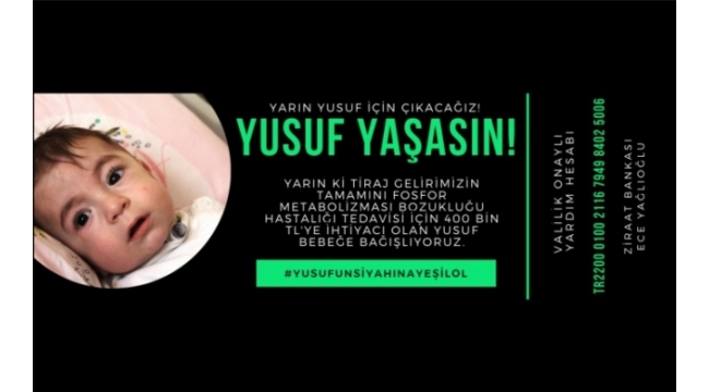 Sakarya’nın en köklü gazetesi Adapazarı Akşam Haberleri, yarınki tiraj gelirini Fosfor Metabolizması Bozukluğu hastası yusuf Bozkurt’a bağışlayacağını sürmanşetten duyurdu. Tedavi için gereken ilaçların temini için 400 bin TL gerektiğini ve şuana kadar 153 bin TL toplandığını belirten minik Yusuf’un ailesi bu farkındalık kampanyası için akşam haberleri Yönetim Kurulu’na teşekkür etti.