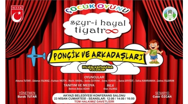 Akyazı Belediye Başkanı Hasan Akcan’ın talimatı ile harekete geçen akyazı Belediyesi Kültür ve Sosyal İşler Müdürlüğü, “Seyri Hayal Tiyatro” grubunu 23 Nisan Ulusal Egemenlik ve Çocuk bayramında çocuklara tiyatro gösterisi düzenleyeceğini bildirdi. Yaklaşık 1 aydır provalarını sürdüren Milli Türk Talebe Birliği tiyatro ekibi Seyri Hayal Tiyatro grubu tüm hazırlıklarını tamamlayarak, 23 Nisan Ulusal Egemenlik ve Çocuk bayramında çocuklara bir oyun hazırladı. Yönetmenliğini Burak Tutar, Yardımcı yönetmenliğini Furkan Özel’in yaptığı ‘Ponçik ve Arkadaşları’ adlı tiyatro oyununu Cabir Özcan yazdı.
