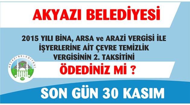 Akyazı Belediyesi Gelir Şefliği 2015 yılı Bina arsa ve arazi vergileri ile işyerlerine ait Çevre Temizlik Vergilerinin 2. Taksit ödemeleri başladığını ve ödemelerin en geç 30 Kasım’a kadar yatılabileceği ile ilgili vatandaşlara önemli hatırlatmada bulundu.
