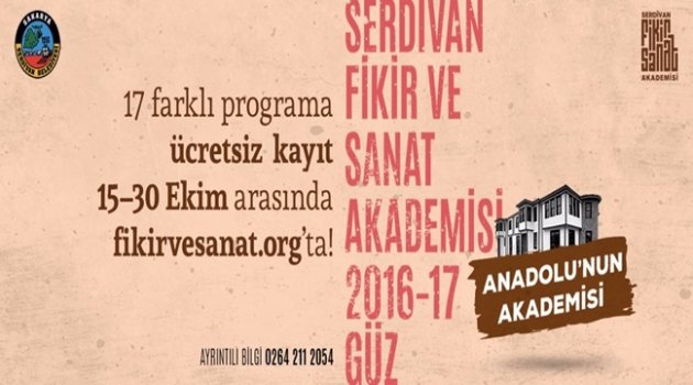 İlk Ders Teoman Duralı’danAkademi’nin yeni dönem açılışı Türkiye’nin önde gelen felsefecilerinden Prof. Dr. Teoman Duralı ile 31 Ekim Pazartesi günü saat 19.30’da gerçekleştirilecek.Anadolu’nun Akademisi’nde yeni dönem kadrosu şu isimlerden oluşuyor:Kültürel Çalışmalar Programı: Rahmi Karakuş, Nurullah Ardıç, Mehmet Genç, Süleyman Seyfi Öğün ve Ömür Ceylan.Sinema Sanatları Programı: Ali Gemuhluoğlu ve Aybars Bora KahyaoğluMüzik Akademisi Programı: Ahmet Şahin ve Mustafa Doğan Dikmen Edebi Çalışmalar: Ömür Ceylan ve Suat CebeciGeleneksel Sanatlar: Songül Ergün ve Orhan AltuğAyrıca bağımsız programlarda Görsel Kültür ve Fotoğraf’ta Nevzat Yıldırım,Tasavvuf Okumaları’nda Ali Vasfi Kurt, Yeni Medya’da Ekmel Geçer, Psikoloji’nin Temel Meseleleri’nde Mehmet Kaya ve İsagoci Dersleri’nde Servet Kızılay bu dönem Serdivan Fikir Sanat Akademisi’nin kadrosunda yer alıyor.Dönem Sonunda Sunum YapılacakKonu ile ilgili Serdivan Fikir ve Sanat Akademisi’nden yapılan açıklamada ücretsiz olarak 17 farklı programla başlayacak olan güz döneminin 6 hafta süreceği belirtilirken, 6 haftanın sonunda Kültürel Çalışmalar Programı öğrencilerinin Sosyal Bilimler alanında sunum yapacağı bildirildi.Başvurular İçin Son Gün 30 EkimAçıklamada ayrıca, güz dönemine kayıt yaptırmak isteyen öğrencilerin başvurularını Serdivan Fikir ve Sanat Akademisi’nin www.fikirvesanat.org internet adresinden 30 Ekim 2016 Pazar gününe kadar yapmaları gerektiği belirtildi.