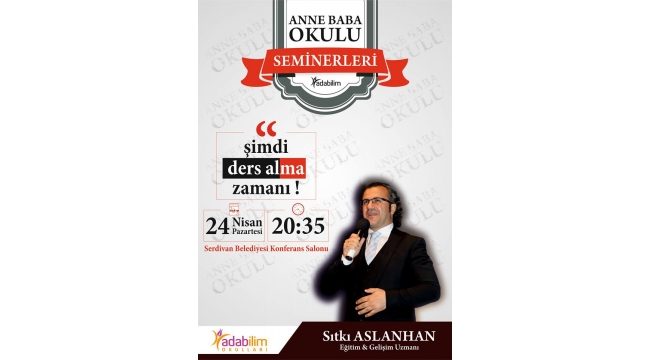 Hem il içinden hem de il dışından gelen ve konunun uzmanları tarafından verilen seminerlerin ilki birinci dönem Aile Danışmanı ve Psikolog Semiha Sezer’in katılımıyla gerçekleştirilmişti. İkinci dönem semineri ise tanınmış Kişisel Eğitim ve Gelişim Uzmanlarından Sıtkı Aslanhan tarafından bu akşam Serdivan Belediyesi Konferans salonunda yapılacak. Saat 20:35’te başlayacak olan program okul velilerine ve tüm anne babalara yönelik ücretsiz ve halka açık olacak. Adabilim Okulları Halkla İlişkiler Müdürü Ali Türkhan gerçekleşecek olan seminer ile ilgili bilgi vererek “ Anne baba Okulu seminerlerini öğrenci - veli - okul arasında ilişkiyi sağlıklı yürütebilmek, doğru ve ortak hareket edebilmek amacıyla düzenliyoruz. Öğrencilerimizin akademik başarılarını takip ettiğimiz gibi ailesiyle olan iletişimini ve okul dışında yaşam alanındaki davranışlarını da gözlemliyoruz. Çünkü biz adabilim okulları olarak uzun vadeli ve nitelikli başarıların öğrenci - veli - okul arasındaki sağlıklı iletişim ile gerçekleşeceğine inanıyoruz.” dedi.
