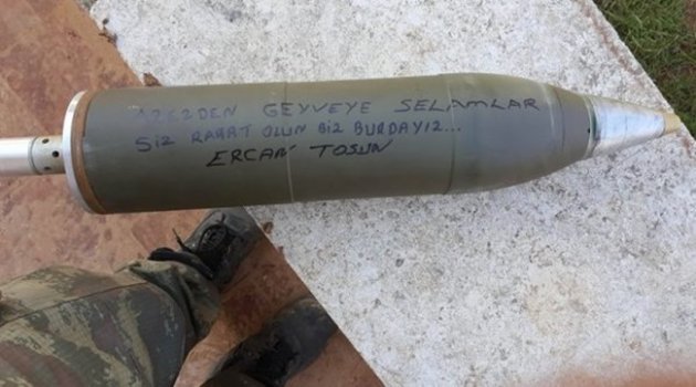 SURİYE’de sürdürülen Fırat Kalkanı Harekatı’na katılan Geyveli Ercan Tosun, terör örgütü DEAŞ unsurlarına yönelik kullanılan mühimmatın üzerine duygularını yazarak selam gönderdi.