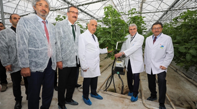 Büyükşehir Belediye Başkanı Ekrem Yüce, topraksız ve jeotermal tarımda rol model olarak nitelendirilen Akyazı Seracılık Mükemmeliyet Merkezi'nde Tarım Bakanı Vahit Kirişçi'yi ağırladı. 25 bin metrekare kapalı alanda yapılan topraksız tarımda kullanılan teknikleri tüm detaylarıyla anlatan Yüce, üst düzey teknolojisi ve maksimum verim kapasitesiyle tarımda Türkiye'de ve hatta dünyada öncü isimlerin serayı ziyaret ettiklerine dikkat çekti.