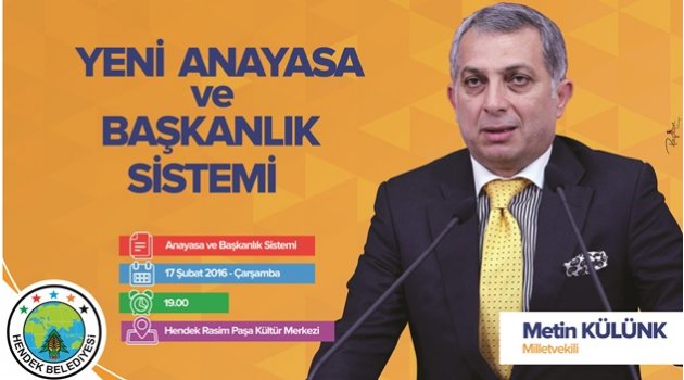 Hendek Belediyesi, kültür-sanat etkinlikleri kapsamında 17 Şubat Çarşamba Günü konferans düzenlenecek. “Başkanlık Sistemi ve Yeni Anayasa” isimli konferansa konuşmacı olarak AK Parti İstanbul Milletvekili Metin Külünk katılacak. Saat 19.30’da başlayacak olan konferans, Rasimpaşa Kültür Merkezi’nde gerçekleştirilecek.