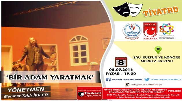 Gençlik ve Spor Bakanlığının Gençlik Projeleri Destek Programı kapsamında düzenlenen MTTB Kuruluşunun 100. Yılında Medeniyet Okumaları ve Yarın ki Türkiye İnşası projesi ile bir çok program düzenleyen MTTB Sakarya Teşkilatı, projenin son virajına girdiği dönemde birbirinden keyifli programlar düzenliyor.1 Hafta Sürecek8-15 Mayıs tarihleri arasında üç tiyatro ve bir şiir dinletisi programı tertip edildi. Buna göre 8 Mayıs Pazar Başkent Şehir Tiyatrolarının Bir Adam Yaratmak, 10 Mayıs Salı Bursa Şehir Tiyatrolarının Reis Bey oyunu Sakarya Üniversitesinde sergilenecek. 11 Mayıs Çarşamba günü de Serdar Tuncer’i ağırlayacak olan MTTB Sakarya, kendisiyle yine SAÜ’de düzenlenecek olan şiir dinletisini gerçekleştirecek ve son olarak MTTB Seyr-i Hayal ekibinin Üstad Necip Fazıl’ı anlatan tiyatro oyununu 15 Mayıs Pazar AKM’de sergileyerek Üstadı Anlıyoruz haftasına son verecekİlk Program Bir Adam YaratmakÜstadı Anlıyoruz haftasının ilk programı Genel Sanat Yönetmenliğini Mehmet Tahir İkiler’in yaptığı Başkent Şehir Tiyatrolarının Bir Adam Yaratmak oyunu olacak. Necip Fazıl Kısakürek’in yazdığı Bir Adam Yaratmak Tiyatrosunu 700’ün üzerinde sahneleyen ve birçok dalda ödül alan Mehmet Tahir İkiler’in ekibi Başkent Şehir Tiyatroları, Sakarya Üniversitesinde de programı ikinci kez sergilemiş olacak. Sakaryalı tiyatro severlerin ilgiyle takip etmesi beklenen program 8 Mayıs Pazar günü Saat 19.00’da SAÜ Kültür ve Kongre Merkezi Salon 1’de gerçekleştirilecek.