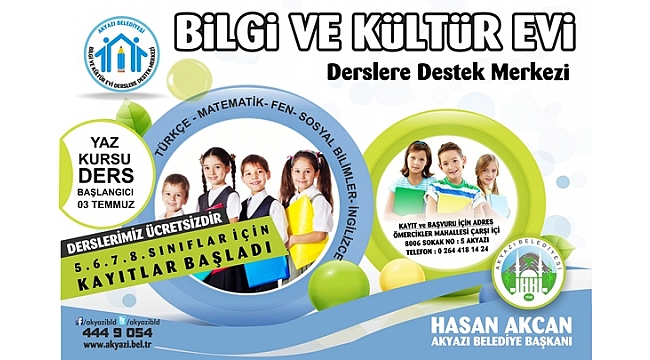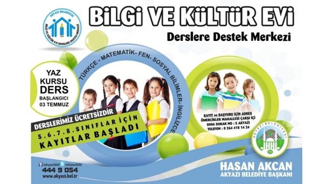 Akyazı Belediyesi Bilgi ve Kültür evi Derslere Destek merkezi tarafından her yıl devam ettirilen ve bu yılda öğrencilerin başarılarına başarı katacak Ücretsiz Yaz Kursu Ders kayıtları başladı.