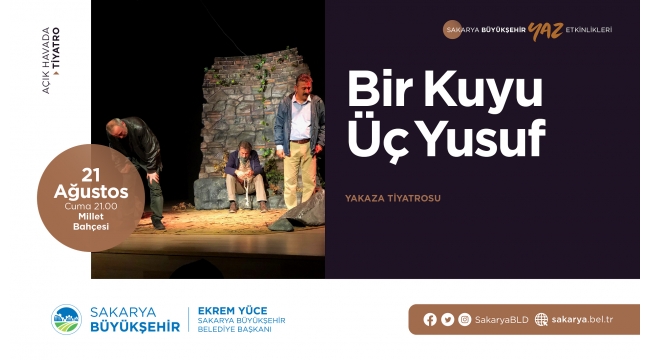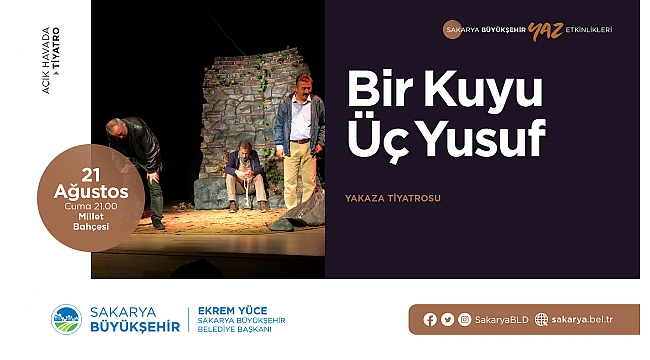 Büyükşehir Belediyesi tarafından düzenlenen yaz etkinlikleri kapsamında ‘Bir Kuyu Üç Yusuf’ isimli tiyatro oyunu sahnelenecek. Tiyatro 21 Ağustos Cuma günü saat 21.00’de başlayacak.