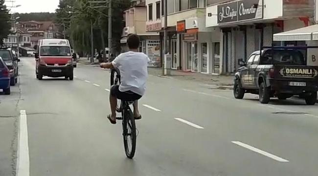 Akyazı ilçesi Ada Caddesi üzeri Yeni Cami mevkinde iki gencin bisikletlerinin ön tekerleklerini havaya kaldırarak yaptığı yolculuk yürekleri ağızlara getirdi. Yanından geçen araçlara hiç aldırış etmeden tek teker üstünde sürmeye devam eden gençler sürücülerin tepkilere aldırış etmeden tehlikeli yolculuklarına devam etti. Bisikletlerini tek teker üzerinde sürmeye devam eden gençler yol kenarında park halindeki araçları sıyırarak ilerlerken vatandaşların çektiği fotoğraflar tehlikeli yolculuğu gözler önüne serdi.
