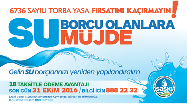 Sakarya Büyükşehir Belediyesi Su ve Kanalizasyon İdaresi tarafından yapılan açıklamada, su borcu olan vatandaşlara faiz indirimi ve taksitlendirme imkânı sunan 6736 sayılı Torba Yasa kapsamında başvuruların alınmaya başlandığı ifade edilerek, “Su borçlarını yapılandırmak isteyen vatandaşlarımızın başvuruları alınmaya başlanmıştır. Yasa ile borçlu vatandaşların ödeme vadesi 30 Haziran 2016 tarihi ve öncesinde birikmiş borçları yeniden yapılandırılacaktır. Faizler silinerek tekrar yapılandırılmaktadır. Yasa ayrıca borcu olan vatandaşlara borçlarını 2 ayda bir ödenmek üzere 18 aya kadar taksitlendirme kolaylığı da sağlamaktadır. Torba yasadan faydalanmak isteyen aboneler 31 Ekim 2016 tarihine kadar başvuruda bulunabilirler. Ayrıca SASKİ Genel Müdürlük binasında Cumartesi günleri de başvuru yapılabilir. Vatandaşlarımız (0264) 888 22 32 nolu telefonu arayarak konu ile ilgili ayrıntılı bilgi alabilirler” denildi.