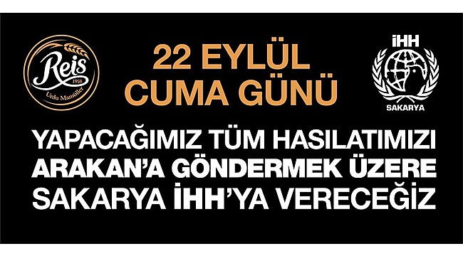 Sakarya İHH tarafından yapılan açıklamada şehrimize hizmet veren Reis Unlu Mamülleri 22 Eylül Cuma (Bugün) yapılan satışlardan elde edilen tüm gelirin arakan için bağışlanacağını ifade etti.Reis Unlu Mamülleri yöneticilerine teşekkür eden sakarya İHH Başkanı Sebahattin Aydın, bu tarz hassasiyete sahip insanlarımızı görmek bizleri mutlu ediyor. Nerede bir zulüm açlık yokluk varsa bu necip millet her zaman onların yanında olmuştur. Tüm hayırseverlerimizden Allah razı olsun dedi.