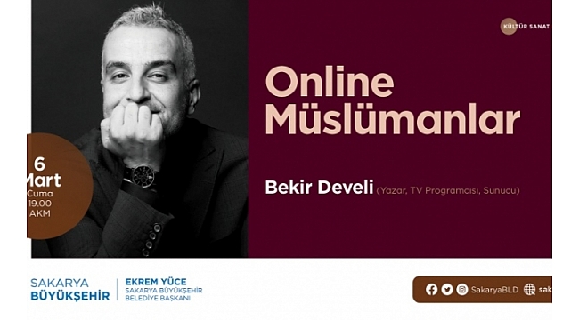 Büyükşehir’de Kültür Sanat Etkinlikleri 6 Mart Cuma Günü AKM’de gerçekleştirilecek olan “Online Müslümanlar” adlı söyleşi ile devam edecek.Sakarya Büyükşehir Belediyesi Mart Ayı Kültür Sanat Etkinlikleri 6 Mart Cuma günü saat 19:00’da gerçekleştirilecek. Yazar, TV Programcısı, Sunucu Bekir Develi’nin konuşmacı olacağı söyleşi, 19:00’da AKM’de başlayacak.