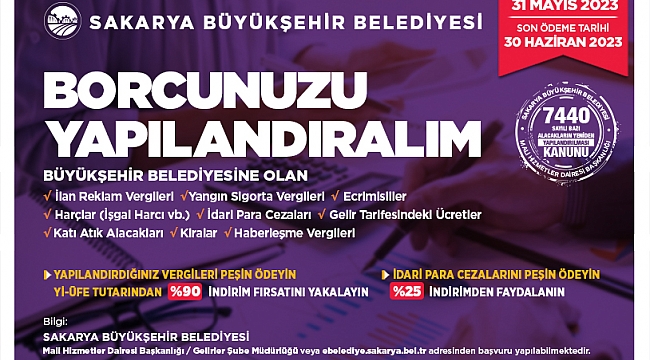 Sakarya Büyükşehir Belediyesi Mali Hizmetler Dairesi Başkanlığı Gelirler Şube Müdürlüğü tarafından, 12 Mart Pazar günü yürürlüğe giren 7440 Sayılı Bazı Alacakların Yeniden Yapılandırılmasına ilişkin kanun hakkında açıklama yapıldı. Vatandaşların yapılandırma kanunundan faydalanarak Büyükşehir Belediyesine olan birikmiş borçlarının kolaylıkla ödenebileceği, başvuruda bulunmak isteyen vatandaşların başvurularını 31 Mayıs Çarşamba gününe kadar Büyükşehir Belediyesi Gelirler Şube Müdürlüğüne şahsen veya posta aracılığıyla yapabilecekleri dile getirildi. Yapılandırma işlemlerinin Büyükşehir Belediyesi’nin resmi internet sayfası https://ebelediye.sakarya.bel.tr üzerinden de gerçekleştirilebileceği belirtildi. 250 TL’yi aşmayan belediye alacakları siliniyorMali Hizmetler Daire Başkanlığı Gelirler Şube Müdürlüğü, yaptığı açıklamada, “Resmi Gazetede yürürlüğe giren 7440 Sayılı Bazı Alacakların Yeniden Yapılandırılmasına İlişkin Kanun ile vatandaşlarımızın Büyükşehir Belediyesine olan borç ödemelerine taksitlendirme imkanı sunulmuştur. Bu yapılandırma kanununun, önceki yapılandırmalardan en önemli farkı, 31/12/2020 tarihinden önceki 250 TL’yi aşmayan asli alacakların Yapılandırma Kanunu kapsamına tahsilinden vazgeçilmesidir. Ayrıca belediye kiracılarının kira borçları ile tahsil edilemeyen idari para cezaları da daha önceki yapılandırma kanunundaki gibi bu kanunda da kapsam altına alınmıştır. Yine gelir tarifesindeki tüm kalemler yapılandırma kapsamına girmektedir” ifadeleri kullanıldı.İdari Para Cezaları ve kiralar da Yapılandırma KapsamındaAçıklamada kira yapılandırma ve idari para cezalarının da kanun kapsamında olduğu belirtilerek, “Kanun, Büyükşehir Belediyesi’ne olan idari para cezaları da dahil tüm borçları ( kira dahil) kapsamaktadır. Bu kapsamda taksitlendirmeye giren borçlar; vadesi 31/12/2022 tarihinden (bu tarih dahil) önce olan İlan-Reklam Vergisi, Haberleşme Vergisi, Yangın Sigorta Vergisi, Ecrimisiller, Harçlar, Gelir tarifesindeki tüm ücretler (hat ücretleri, koltuk artırım bedelleri, imar hizmet ücretleri, hafriyat döküm ücretleri vb.) idari para cezaları ( Kabahatler Kanununa, Çevre Kanununa vb. göre kesilenler) katı atık ücretleri, taşınmaz kira ve satış bedelleri. Büyükşehir’e olan borçlarını sorgulamak isteyen vatandaşlarımız https://ebelediye.sakarya.bel.tr adresinden geçmiş borç bilgilerine ulaşabilecektir” ifadelerine yer verildi.İlk taksit 30 Haziran’daAçıklamada taksitlendirme imkanına da vurgu yapılarak, “Vatandaşlarımız yapılandırmanın ilk taksitini ise 30 Haziran Perşembe gününde ödeyecek. 12-18-24-36-48 aylık taksit imkânlarından faydalanabilecektir. Pek çok avantajı içinde barındıran düzenlemede ödeme kolaylığı sağlanması amacıyla taksitler aylık ödemeler halinde azami kırk sekiz eşit taksitte alınacak. Borç asıllarının tamamı ile Yİ-ÜFE* oranında hesaplanan tutarın ödenmesi halinde, gecikme faizi ve zammı silinecektir. Yine peşin ödemede bulunmak isteyen vatandaşlarımızın Yİ-ÜFE oranında ayrıca yüzde 90 indirim sağlanacaktır. Dolayısıyla vatandaşlar peşin ödemelerde ekstra avantaj elde edecekler. Taksit seçeneğini seçip ilk taksiti ödeyemeyen ya da eksik ödeyen mükellefin ilk taksiti izleyen ayın sonuna kadar geç ödeme zammı ile birlikte ödemesi imkanı da bulunmaktadır. Bu Yapılandırma Kanununun da bir önceki yapılandırma kanunu gibi İdari Para Cezalarına taksitlendirme imkanı getirilmiştir. İdari Para Cezalarını taksitlendiren vatandaşlarımızın Peşin ödeme yapmaları halinde %25 indirim uygulanacaktır. Yapılandırmanın en önemli şartının ise önceki yapılandırmalardaki gibi ilk iki taksitin mutlaka süresinde ödenmesi olduğu, kapsamlı ve avantajlı bu düzenlemeden faydalanmak isteyen tüm vatandaşların detaylı bilgi için Gelirler Şube Müdürlüğüne başvurmaları gerekiyor” denildi
