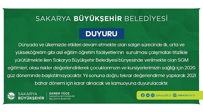 Büyükşehir Belediyesi bünyesinde hizmet veren ve Covid-19 salgını nedeniyle daha önce faaliyetlerine geçici bir süre ara veren Sosyal Gelişim Merkezleri, 2020 güz dönemi eğitimlerini erteledi. Sakarya Büyükşehir Belediyesi tarafından Sosyal Gelişim Merkezleri’nde ki derslerin ertelenmesi ile alakalı bir açıklama yapıldı. Sosyal Gelişim Merkezleri, eğitimlerde oluşabilecek riskleri değerlendirerek kursiyerlerin sağlığı söz konusu olduğundan 2020 güz döneminde derslerin başlatılamayacağını bildirildi. Dersler başlatılmayacakBüyükşehir’den yapılan açıklamada, “ Dünyada ve ülkemizde etkileri devam etmekte olan salgın sürecinde ilk, orta ve yükseköğretim gibi asli eğitim öğretim faaliyetlerinin sunulması çalışmaları titizlikle yürütülmekte iken Sakarya Büyükşehir Belediyesi bünyesinde verilmekte olan SGM eğitimleri, olası riskler değerlendirilerek çocuklarımızın ve kursiyerlerimizin sağlığı için 2020 güz döneminde başlatılmayacaktır. Yılsonuna doğru tekrar değerlendirme yapılarak 2021 bahar dönemi için karar alınacak ve kamuoyuna duyurulacaktır” denildi.