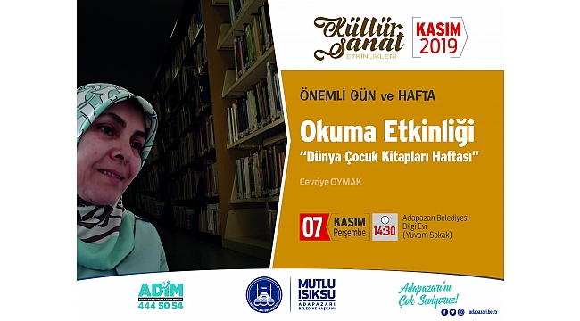 Adapazarı Belediyesi Kasım ayı Kültür Sanat programları, çocuk edebiyatının Sakaryalı yazarı Cevriye Oymak’ın okuma etkinliği ile devam edecek. Oymak, Dünya Çocuk Kitapları Haftası kapsamında, 7 Kasım Perşembe günü saat 14.30’da Merkez Bilgi Evi’nde kitapseverlerle buluşacak.