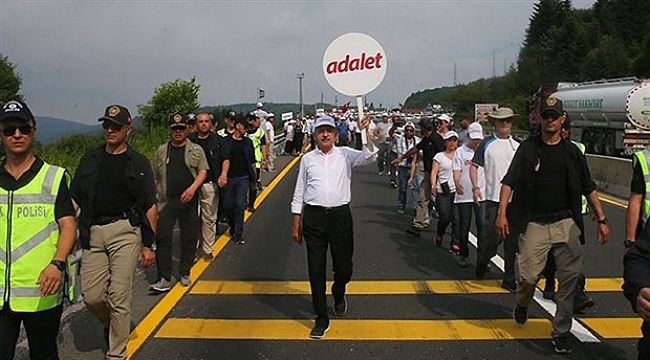 CHP Milletvekili Enis Berbereoğlu'nun tutuklanmasının ardından Güvenpark'tan başlatılan yürüyüş Sakarya'dan devam ediyor. chp Genel Başkanı Kemal Kılıçdaroğlu'nun öncülüğünde Düzce Gümüşova bölgesinde başlayan yürüyüş yaklaşık üç saat sürdü. Yaklaşık 8 kilometreyi bulan yürüyüşte hava sıcaklığı 34 dereceyi buldu. Güzergah üzerinde kurulan stantlarda vatandaşlara ücretsiz su ve meyvesuyu ikram edildi. Tek şeritten kapatılan yolda uzun kuyruklar oluşurken, İzmir’den gelen bando takımı da yürüyüşe çaldıkları parçalarla destek verdi. Trabzon, Giresun ve diğer illerden de yoğun katılımın olduğu yürüyüşte jandarma ve polis güzergah boyunca geniş güvenlik önlemleri aldı. Heyet, yaklaşık üç saat süren yürüyüşün ardından ilk mola yerine vardı.