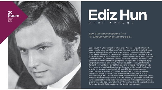 Sakarya Büyükşehir Belediyesi Kültür ve Sosyal İşler Dairesi Başkanlığı tarafından düzenlenen Kasım Kültür Sanat Etkinlikleri tüm hızıyla devam ediyor. Söyleşilerden panellere, tiyatro buluşmalarından konserlere kadar birbirinden renkli programları Sakaryalılar ile buluşturan etkinlik takvimi kapsamında Türk Sinemasının ve Yeşilçam’ın ünlü aktörü Ediz Hun’a saygı gecesi düzenlenecek.20 Kasım Cuma20 Kasım Cuma günü AKM’de gerçekleştirilecek programda Sinema araştırmacıları, dostları ve öğrencileri Ediz Hun’un hayatını ve hatıralarını konuşacak. Kültür ve Sosyal İşler Dairesi Başkanlığı tarafından yapılan açıklamada, Ediz Hun’un onur konuğu olarak katılacağı programın saat 19.00’da başlayacağı belirtilerek, etkinliğe tüm kültür sanat dostları davet edildi.