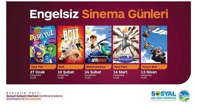 Sakarya Büyükşehir Belediyesi Sosyal Hizmetler Dairesi Başkanlığı Engelli Hizmetleri Şube Müdürlüğü tarafından düzenlenen engelsiz sinema Günlerinde yeni dönem başlıyor. Sosyal Hizmetler Dairesi Başkanı Davut Yüce, “Büyükşehir Belediyesi olarak engelli vatandaşlarımız için ücretsiz düzenlediğimiz sinema günlerimizde yeni dönem başlıyor. Sosyal Gelişim Merkezi’nde gerçekleştireceğimiz ilk gösterim, 27 Ocak Çarşamba günü, saat 14.00’da başlayacak” ifadelerini kullandı. ‘Hayatı Paylaşmaya Engel Yok’Yüce açıklamalarını şu şekilde sürdürdü; “Engelli kardeşlerimize yönelik çalışmalarımızı aralıksız sürdürüyoruz. Merkezimizde eğitimler sunuyoruz. Bildiğiniz üzere kısa süre önce Engelsiz Kafe’yi hizmete aldık. ‘Hayatı Paylaşmaya Engel Yok’ hedefiyle çıktığımız bu yolda önemli çalışmaları hemşerilerimiz ile buluşturuyoruz. İnşallah sinema günlerimizde engelli kardeşlerimize sosyal anlamda katkı sağlayacaktır.” Film Gösterimlerine DavetEngelsiz Sinema Günleri takvimi ile ilgili de bilgiler veren Yüce, “Engelsiz Sinema Günleri kapsamında ilk gösterim 27 Ocak Çarşamba günü, ‘Ters Yüz’ filmi ile başlayacak. Ardından 10 Şubat Çarşamba ‘Bolt’, 24 Şubat Çarşamba ‘Bitirim Karınca’, 16 Mart Çarşamba ‘Aşçı Fare’ ve 13 Nisan Çarşamba ‘Yukarı Bak’ filmleri engelli kardeşlerimizi ile buluşacak. Etkinliğimize katılmak isteyen vatandaşlarımız Engelli Hizmetleri Şube Müdürlüğü’nden kayıt işlemlerini yaptırabilir. Ayrıntılı bilgi almak için müdürlüğümüzün 281 88 05 nolu telefonu aranabilir. Tüm vatandaşlarımız sinema günlerine davetlidir” diye konuştu.