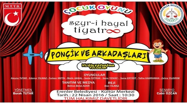 Erenler Belediyesi Kültür Merkezinin Tiyatro Salonunda ücretsiz olarak çocukların beğenisine sunulacak çocuk tiyatrosu 22 Nisan Cuma günü saat 10.30’da başlayacak.Etkinlik kapsamında Seyri Hayal Tiyatrosu, “Ponçik ve Arkadaşları – İyiliğin Kaynağına Yolculuk” adlı çocuk oyunu ile sahne alacak.