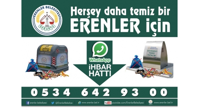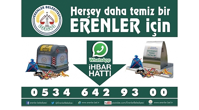 Erenler Belediyesinin yeni uygulaması whatsapp temizlik ihbar hattı hizmete girdi. Vatandaşlar bundan böyle 0534 642 93 00 numaralı hattın whatsapp uygulamasına çevre ve temizlik konularında şikâyet ve taleplerini bildirebilecek.