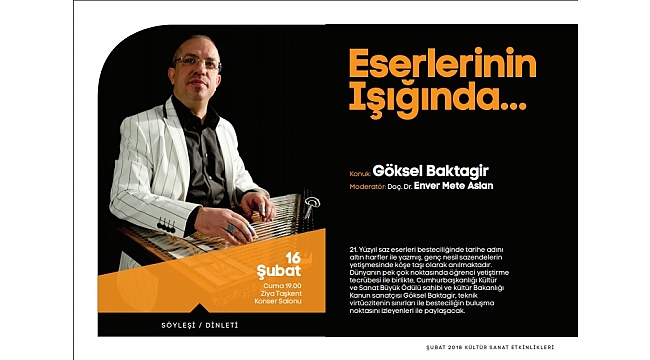 Sakarya Büyükşehir Belediyesi Şubat Kültür Sanat Etkinlikleri Göksel Baktagir’in katılımıyla gerçekleştirilecek ‘Eserlerinin Işığında’ isimli söyleşi ve dinleti programı ile devam edecek. Programın moderatörlüğünü Doç. Dr. enver mete aslan üstlenecek. Dünyanın pek çok noktasında öğrenci yetiştirme tecrübesi ile birlikte, Cumhurbaşkanlığı Kültür ve Sanat Ödülü sahibi, Kültür Bakanlığı Kanun sanatçısı Göksel Baktagir, 16 Şubat Cuma günü Ziya Taşkent Konser Salonunda Sakaryalı sanatseverler ile buluşacak. Kültür ve Sosyal İşler Dairesi Başkanlığı’ndan yapılan açıklamada programa tüm müzikseverler davet edildi.