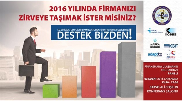 Biz, KOBİ’lerimizin, yeni istihdam oluşturma, yeni ürün ve hizmet geliştirme, girişimciliği ve ülkemizin rekabet gücünü artırma gibi hususlarda çok önemli rol oynadıklarının bilincindeyiz. Bu nedenle SATSO olarak üyemiz olan KOBİ’lerin büyümelerini teşvik etmek, 2016 yılının onlar için bir atılım yılı olmasını sağlamak amacıyla üyelerimizin faydalanabilecekleri destek ve finansman modelleri hakkında detaylı bir bilgilendirme yapmayı vazife olarak görmekteyiz.  Bu itibarla; 03 Şubat 2016 Çarşamba günü 13.30 – 17.30 saatleri arasında SATSO Ali Coşkun Konferans Salonunda KOSGEB-MARKA-KGF-İŞKUR- ADAPTTO-ABİGEM yetkililerinin katılımıyla düzenlenecek ve 2016 yılında uygulanacak destek programları hakkında detaylı bilgilerin aktarılacağı “Finansmana Ulaşmanın Yol Haritası” konulu panele tüm KOBİ’lerimizi davet ediyorum”