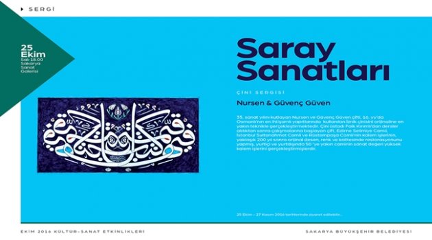Büyükşehir Belediyesi Sakarya Sanat Galerisi yeni bir sergiye daha ev sahipliği yapacak. ‘Saray Sanatları’ konulu çini sergisi 25 Ekim Salı günü sanatseverlerin beğenisine sunulacak.