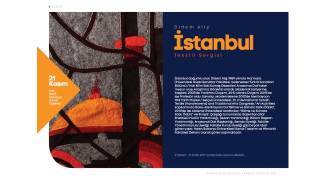 Sakarya Büyükşehir Belediyesi Kasım Kültür Sanat Etkinlikleri Didem Atiş‘in ‘İstanbul’ adlı tekstil sergisi ile devam edecek. 21 Kasım Salı günü sakarya Sanat Galerisi’nde gerçekleştirilecek olan etkinlik, saat 18.00’da başlayacak. Kültür ve Sosyal İşler Dairesi Başkanlığı’ndan yapılan açıklamada, “Didem Atiş’in İstanbul isimli tekstil sergisine tüm sanatseverler davetlidir” ifadelerine yer verildi.