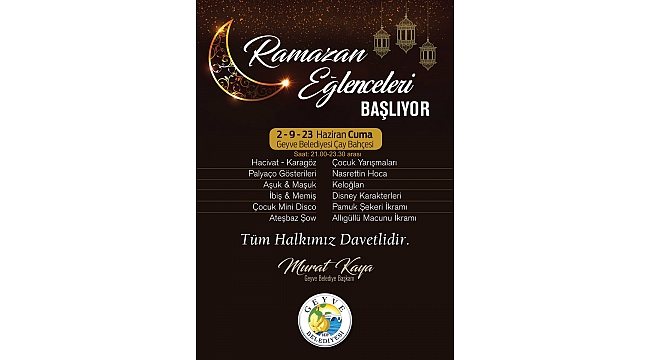 Bu Ramazanda Geyve’li çocuklar geyve Belediye Parkında kendileri için özel hazırlanan alanlarda Ramazan’ın neşesini doyasıya yaşayacak.Geyveli çoçuklarımız ile ailelerine yönelik Hacivat-Karagöz, Palyaço gösterileri, Çocuk yarışmaları, Aşuk-Maşuk, Keloğlan, Nasrettin Hoca, İbiş-Memiş, Disney karakterleri, Çoçuk mini disco, Ateşbaz Şhov gösterilerinin yer aldığı programlarda çocuklara Pamuk şekeri ve allıgüllü macunu ikramı yapılacak.Geyve Belediye Başkanı Murat Kaya;Geyve Belediyesi olarak bu yıl Geyve Belediye parkında çoçuklarımıza unutulmaz bir ramazan yaşatacağız. Ailelerimiz ve çocuklarımız gönüllerince eğlenecek. Hemşerilerimiz hem geçmiş Ramazanları yâd edecek hem de eğlenecek.Bu etkinliklerimize tüm ailelerimizi bekliyoruz.