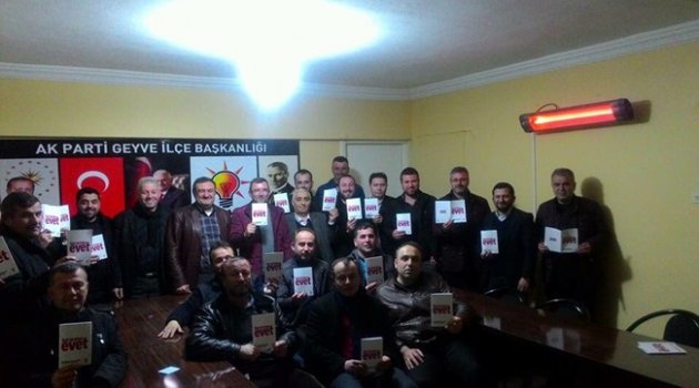Ak Parti Geyve ilçe başkanı Muhittin Irmak; “Referandum ana gündem maddesiyle toplandıklarını, yakın zaman içerisinde tüm vatandaşlara bu sistemin anlatılacağı programlar düzenlenerek bilgilendirme çalışmalarına başlanacak. Halkımıza neden “EVET” diyeceğimiz açıklanacak. Kapı, kapı gezilerek kitapçıklar herkese ulaştırılacak. Başbakanımızın seçim start’ından sonra tekrar mahalle mahalle gezerek “Güçlü Türkiye İçin” bu sistemi vatandaşlarımıza anlatacağız” dedi.