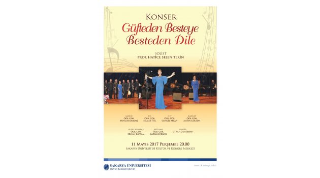 Sakarya Üniversitesi Devlet Konservatuvarı tarafından 11 Mayıs 2017 tarihinde, “Güfteden Besteye, Besteden Dile” isimli bir konser düzenlenecek. SAÜ Kültür ve Kongre Merkezi’nde düzenlenecek olan etkinliğin solistliğini SAÜ Devlet Konservatuvarı Müdürü Prof. Hatice Selen Tekin üstlenecek. Prof. Dr. Tekin’e Kanunda Öğr. Gör. Tuncay Kardaş, UddaÖğr. Gör. Hamdi İtil, Neyde Öğr. Gör. Cengiz Atlan, Klarnette Öğr. Gör. Metin Gülsün, Klasik Kemençede Öğr. Gör. Erhan Bayram, Bağlamada Öğr. Gör. Kazım Gürkan ve Bendirde Utkan Demirkan eşlik edecek.