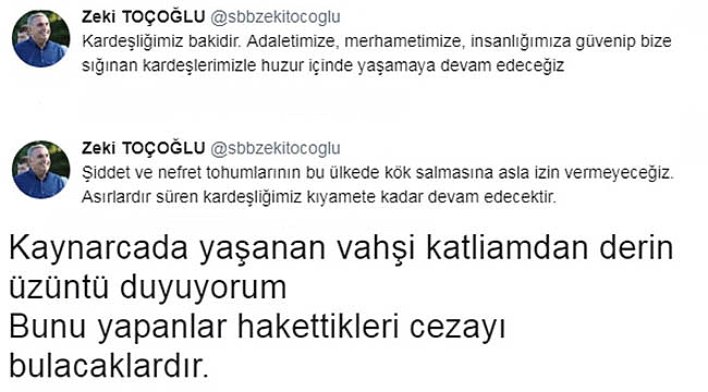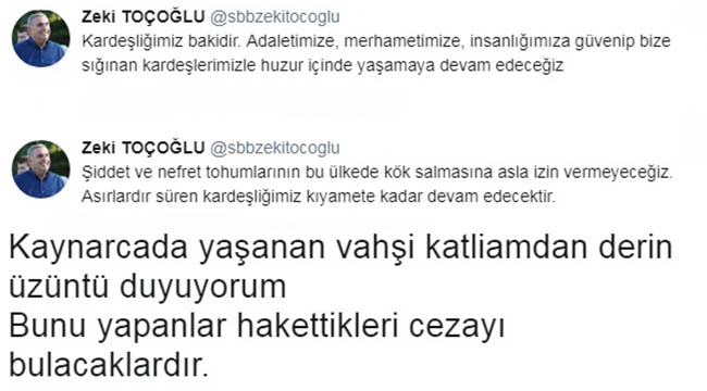 Sakarya Büyükşehir Belediye Başkanı Zeki Toçoğlu, ülkelerinde yaşanan savaş nedeniyle Türkiye’ye sığınan Suriyeli bir hamile kadın ve 10 aylık çocuğunun Kaynarca’da ormanlık bir alana kaçırılarak vahşice katledilmesini sosyal medya hesabı üzerinden yaptığı açıklamada şiddetli bir şekilde kınadı. kaynarca ilçesi Birlik Mahallesi’nde yaşanan olayda Suriyeli hamile bir kadın ve 10 aylık çocuğu önce ormanlık alana götürülmüş, hamile kadına tecavüz edilmiş, ardından çocuğuyla birlikte başları taşla ezilerek vahşi bir şekilde katledilmişlerdi. Mazlumun yanındayızBaşkan Toçoğlu’nun sosyal medya hesabı üzerinden paylaştığı kınama mesajında, “Kaynarca’da yaşanan vahşi katliamdan derin üzüntü duyuyorum. Bunu yapanlar hak ettikleri cezayı bulacaklardır. Şiddetin dini milleti ırkı mezhebi olmaz. Kim yaparsa yapsın, kime yaparsa yapsın zulüm zulümdür. Bize düşen mazlumun yanında durmaktır. Asırlardır sergilediğimiz duruşumuz budur. Bugün de mazlumun yanında zalimin karşısında yer alacağız. Kardeşliğimiz bakidir. Adaletimize, merhametimize, insanlığımıza güvenip bize sığınan kardeşlerimizle huzur içinde yaşamaya devam edeceğiz. Şiddet ve nefret tohumlarının bu ülkede kök salmasına asla izin vermeyeceğiz. Asırlardır süren kardeşliğimiz kıyamete kadar devam edecektir” ifadelerini kullandı.