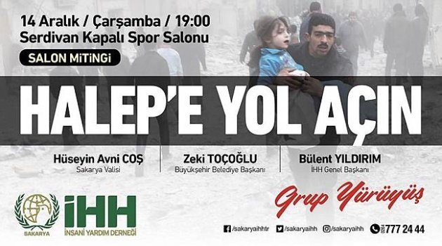 Suriye’de dünyanın gözü önünde sistematik bir katliam gerçekleştiriliyor. Özellikle de son dönemde Halep, Esed rejimi ve Rus güçlerince havadan ve karadan gece gündüz bombalanıyor. Şehirde gıda malzemeleri tükenmiş, sağlık sistemi çökmüş durumda. Tüm bunlar yaşanırken uluslararası toplum üç maymunu oynuyor.Saldırıların başladığı günden bu yana Suriye’ye yönelik yardımlarını aralıksız sürdüren İHH İnsani Yardım Vakfı ise dünyanın sessiz kaldığı Halep’teki duruma dikkat çekmek amacıyla bir kara konvoyu hazırlıyor. 14 Aralık Çarşamba günü İstanbul Kazlıçeşme meydanından Saat 11.00’da yapılacak basın açıklamasının ardından yola çıkması planlanan konvoya Türkiye’nin 81 ili ve yurt dışından da katılımlar olacak. Konvoy güzergahı üzerindeki illerde Halep'teki saldırıları protesto için eylemler yapılacak. Konvoyda, içerisinde temel gıda malzemelerinin yer alacağı yardım TIR’ları olacağı gibi katılımcılar da yanlarında insani yardım malzemeleri getirebilecek. Konvoyun son durağı olan Cilvegözü sınır kapısında da bir basın açıklaması yapılacak. Açıklamada katliamların durdurulması ve insani yardım koridoru açılarak bu yardımların ulaştırılması çağrısı yapılacak.KATILMAK İSTEYENLER İÇİNİstanbul’dan başlayacak ve herkesin kendi özel araçlarıyla katılacağı yolculuğa dahil olmak isteyenler için güzergah ve katılım koşulları:Konvoya Türkiye'nin farklı illerinden katılacaklar için Sakarya, Ankara, Konya, Kayseri ve Kahramanmaraş illeri buluşma noktaları olarak belirlenmiştir. Buluşma noktaları, buluşma zamanları ve detaylı bilgiler başvuru için irtibat kurulan yetkililerden alınabilir.Sakarya’dan konvoya katılacaklar İHH Sakarya şubesine bizzat müracaat edip form doldurarak başvuruda bulunabilecekler. SAKARYA’DA SALON MİTİNGİÖte yandan 14 Aralık Çarşamba Günü "Halep'e Yol Açın" sloganı ile İstanbuldan yola çıkarak Cilvegözü Sınır kapısına hareket edecek konvoy aynı gün Sakarya'ya uğrayacak ve konaklayacağı açıklandı. Aynı gün Serdivan Kapalı spor salonunda bir salonu mitingi düzenlenecek ve Sakaryta Valisi Hüseyin Avni Coş, Sakarya Büyükşehir Belediye Başkanı Zeki Toçoğlu , Abdülmetin Balkanlıoğlu, Prof Faruk Beşer ve İHH Genel Başkanı Bülent Yıldırım birer konuşma yapacak. SPONSOR OLABİLİRSİNİZEkonomik durumu iyi olup zaman darlığından dolayı "Halep'e Yol Açın" konvoyuna katılamayanların ekonomik durumundan dolayı konvoya katılamayacaklar için sponsor olabilecekleri öğrenildi.Konu ile ilgililerin de İHH Sakarya şubesine başvurabilecekleri bildirildi.
