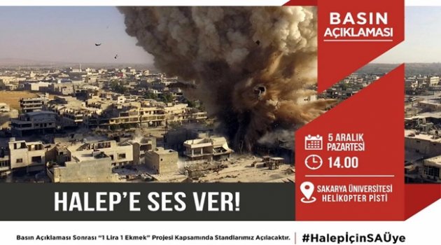 Halep için ses ver ! halep için SAÜ’ye ! sloganları ile 5 Aralık Pazartesi saat 14:00 te Sakarya Üniversitesi Helikopter Pistinde düzenlenecek basın açıklamasına öğrencilerden ve Sakarya’lılardan yoğun bir katılım bekleniyor. Sakarya Üniversiteli gençler basın açıklamasının ardından 1 Lira 1 Ekmek kampanyası başlatarak Halep için 1 tır un yardımı çalışmasına başlayacaklar. Öğrenci toplulukları adına yapılan açıklamada basın mensupları ve tüm halkımız basın açıklamasına davetlidir dendi. DESTEKLEYEN ÖĞRENCİ TOPLULUKLARI: