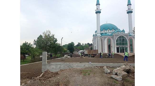 Hendek Belediyesi tarafından Karatoprak Mahallesi Camii bahçesinde kilit parke çalışması yapılıyor.