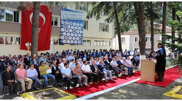 Hendek MYO bahçesinde yapılan törene Hendek Belediye Başkanı İrfan Püsküllü, Eğitim Bilimleri Enstitüsü Müdürü Doç. Dr. Halil İbrahim Sağlam, 2. OSB ile ilçede bulunan işadamları ve öğrenci aileleri katıldı. Yaşanan terör olaylarının acısı nedeniyle buruk bir şekilde geçen törene katılanların, manevi duyguları nedeniyle sevinçlerini ölçülü bir şekilde yaşamaya çalıştıkları gözlerden kaçmadı.Konuşmasına yaşanan terör olayları nedeniyle büyük üzüntü duyduklarını belirterek ve hayatını kaybedenlere Allah’tan rahmet, yakınlarına sabır, yaralılara da acil şifa dileyerek başlayan Hendek MYO Müdürü Yrd. Doç. Dr. Beytullah Eren, Meslek Yüksekokulunda eğitime yönelik faaliyetler ile tüm sosyal, kültürel ve sportif faaliyetlerin 2 bin 800 öğrenci, 40 akademik ve 9 idari personelle gerçekleştirildiğini ifade etti. Eren, mezuniyet töreni vesilesi ile bir kez daha bir araya gelmiş olan personelini konukların huzurunda takdir etti.Mesleki eğitimi uygulamalı bir şekilde vermeyi sağlayan ve ülkemizde 2012 yılından itibaren sadece SAÜ’de uygulanan 3+1 Eğitim Modelinin meyvelerini toplamaya başladıklarını kaydeden Eren, işbirliği yapılan işletmelere bu yıl gönderilen 369 öğrencinin işyeri eğitimini başarı ile tamamladıklarını, işletmelerden öğrencilere dair övgülü dönüşler almanın haklı sevincini yaşadıklarını söyledi. Tüm mezunları kutlayan Eren, mezunların bundan sonraki yaşamlarında, gerek mesleki gerekse insanı davranışları ile SAÜ’yü en iyi şekilde temsil etme sorumluluğunu üstlenmeleri gerektiğini ifade etti. Eren, mezunların mesleki başarılarının Hendek MYO’yu onurlandıracağını da söyledi.2015 yazında Rektörlük, Büyükşehir Belediyesi, Hendek Belediyesi, 2. OSB ve Hendekli işadamlarının destekleriyle yürütülüp tamamlanan Hendek MYO tadilat çalışmalarına katkı sağlayan kişi ve kurumlara bir kez daha teşekkür eden Yrd. Doç Dr. Beytullah Eren, konuşmasına törene katılanların yaklaşan Kadir Gecesi ve Ramazan Bayramlarını kutlayarak son verdi.Törende 2015-2016 Öğretim Yılı Bahar Yarıyılında bölümlerinde onur ve yüksek onur belgesi alan öğrencilere belgeleri verildikten sonra bölümlerinde birinci olan öğrencilere hediyeleri takdim edildi. Elektronik Teknolojisi Bölümü öğrencisi Mert Demirel, yüksekokul birincisi olurken 3,97 not ortalaması ile aynı zamanda sakarya Üniversitesi Meslek Yüksekokulları birincisi oldu. Demirel’e hediyelerini takdim eden Belediye Başkanı İrfan Püsküllü ve MYO Müdürü Yrd. Doç. Dr. Beytullah Eren, öğrenciyi tebrik ederek başarılarının devamını dilediler. Tören toplu kep atımının ardından sona erdi.