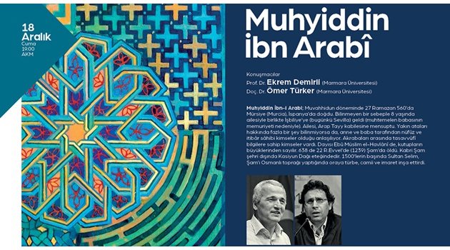 Sakarya Büyükşehir Belediyesi Kültür ve Sosyal İşler Dairesi Başkanlığı tarafından düzenlenen Aralık kültür sanat Etkinlikleri ‘Muhyiddin İbn Arabî’ paneli ile devam edecek. 18 Aralık Cuma günü gerçekleştirilecek programa Marmara Üniversitesi Öğretim Görevlileri Prof. Dr. Ekrem Demirli ve Prof. Dr. Ömer Türker konuşmacı olarak katılacak. Adapazarı Kültür Merkezi’nde gerçekleştirilecek program saat 19.00’da başlayacak. Kültür ve Sosyal İşler Dairesi Başkanlığı’ndan yapılan açıklamada, panele tüm kültür sanat dostları davet edildi.