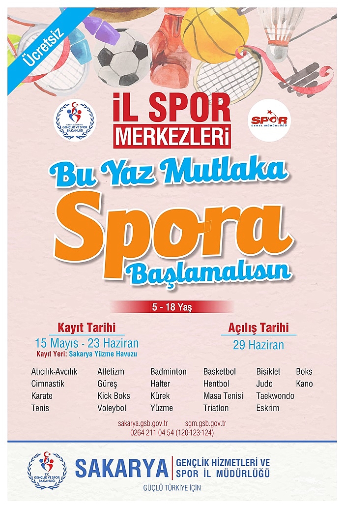 Sakarya Gençlik Hizmetleri ve Spor İl Müdürü Fatih Çelikel ; İl Müdürlüğümüz bünyesinde İl Spor Merkezleri Kapsamında 22 branşta , Engelliler İl Spor Merkezleri kapsamında ise 11 branşta yaz spor kursları açılacaktır. Kayıtlarımız 15 Mayıs 2017-23 Haziran 2017 tarihleri arasında sakarya Yüzme Havuzundaki kayıt bürosunda yapılacaktır. “ dedi.Çelikel ; İl Spor Merkezleri ve Engelliler İl Spor Merkezlerinde 05-18 yaş grubundaki çocuk ve gençlere sporu sevdirerek , onları spora yönlendirmek, spor kulüplerine sporcu kaynağı sağlamak, toplumda spor kültürü oluşturmak ve sporun daha geniş kitlelere yayılmasını sağlamayı hedefliyoruz. Spor Merkezlerimizin açılışını ise ; 29 Haziran 2017 tarihinde Atatürk Spor Salonunda yapacağız. Tüm çocuk ve gençlerimizi , spor kurslarımıza katılmaya davet ediyorum.” şeklinde konuştu.