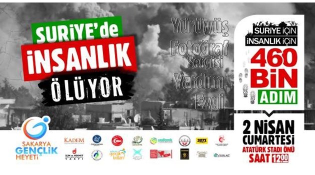 Suriye’de 5 yılda Adapazarı, Erenler ve Serdivan Nüfusu Kadar İnsan KatledildiSakarya Gençlik Heyeti, Suriye’de yaşanan insanlık dramına dikkat çekmek amacıyla düzenlenecek 460 Bin Adım etkinliği ile Suriye’de 5 yılda Adapazarı, Erenler ve Serdivannüfusundan daha fazla sayıda insanın hayatını kaybettiği savaşların bir an önce durması için sokağa iniyor. Yürüyüşün yanı sıra, fotoğraf sergisi ve yardım stantlarının da yer alacağı etkinliğe, İHH Genel Başkanı Bülent Yıldırım ve Grup Yürüyüş de katılımsağlayacak. Hazırlıkların devam ettiğini belirten heyet sözcüsü, tüm Sakaryalı vatandaşların, Suriye halkının bu acısına ortak olmasını istedi.Sakarya Gençlik Heyeti, ülkemizde yaşanan terör olayları ve şehitlerimiz için de gıyabi cenaze namazı kılmış, mevlid-i şerifler okutmuştu. Gerek Türkiye’de, gerekse komşu ülkede yaşanan terör olaylarına karşı toplumu birlik ve beraberlik içinde hareket etmeye davet eden heyet sözcüsü, Sakarya’da Suriye’deki insanlık dramı ile ilgili toplumsal bilinç oluşması için çabalayacaklarını söyledi.