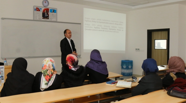 SAÜ İlahiyat Fakültesi Dekanı Prof. Dr. Ahmet Bostancı’nın konuşmacı olarak katıldığı konferans İlahiyat Fakültesinde yapıldı. Konferansta Arapçanın dünya dilleri arasındaki yerini anlatarak konuşmasına başlayan Prof. Dr. Ahmet Bostancı, Arapçanın yaygın şekilde kullanılması bakımından Çince, İngilizce, Hintçe ve İspanyolcadan sonra beşinci dünya dili olduğunu, 1974 yılında Birleşmiş Milletler Teşkilatı tarafından, İngilizce, Fransızca, İspanyolca, Rusya ve Çinceden sonra altıncı resmî dil olarak kabul edildiğini söyledi.Tefsir, Hadis, Fıkıh gibi İslamî ilimlerde temel kaynakların Arapça olduğuna vurgu yapan Bostancı, bu kaynakları anlamanın olmazsa olmazının Arapça bilmek olduğunu belirtti. İslam âlimlerinin dinî ilimleri, Tefsir, Hadis, Fıkıh gibi Ulûm-u âliye (yüksek ilimler) ve Sarf, Nahiv, Belâgat gibi Ulûm-u eliye (vasıta ilimler) olarak ikiye ayırdığını ifade eden Bostancı, ulum-u âliyeye ulaşmada en önemli aracın Arapça olduğuna dikkat çekti.Arapçaya vakıf olmadan Kur'an meali yapmaya kalkışmanın doğru olmadığını kaydeden Dekan Bostancı, bazı meallerde yapılan vahim çeviri hatalarından örnekler vererek, var olan meallerin hangisinin güvenilir olup olmadığını tespit ederken dahi Arapça bilmeye ihtiyaç olduğunu söyledi.İslam tarihinden önemli şahsiyetlerin Arapçanın önemine dair görüşlerini aktaran Prof. Dr. Bostancı, bu çerçevede Şâtıbî’nin “Arapça, Kur’an ve Sünnetin anlaşılmasına vesile olunca, dinî ilim talebesine onu bilmek vacip olur. Çünkü vesileye maksadın hükümleri aynen uygulanır” sözünü nakletti ve Osmanlı son dönemi ve Cumhuriyetin ilk yıllarının önemli isimlerinden âlim, mütefekkir, mütercim Babanzade Ahmet Naim’in “Lisân-ı ‘Arabîniñ Vucûb-i Tahsîli ve Usûl-i Tedrîsi Hakkında Birkaç Söz” adlı yazısındaki görüşlerini anlattı. İslam kültür ve medeniyetinin harikalarının ulaşılmayı bekleyen sayısız eserde saklı olduğunu ifade eden Prof. Dr. Ahmet Bostancı, konuşmasını Babanzade Ahmet Naim Efendi'nin “Hiç şüphe yoktur ki, Kur ân ve hadis önümüzde Arapça olarak dururken, kıyamete kadar bu dilin öğrenilmesinden vaz geçemeyeceğiz” sözü ile sonlandırdı. Soruların cevaplandırılmasının ardından program, hediye takdimi ile son buldu.