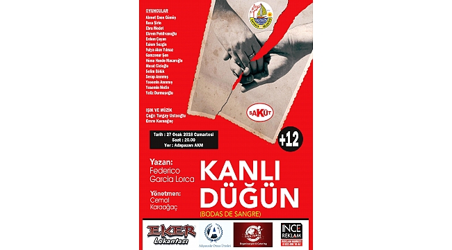 Dünyaca ünlü bir oyun olan Federicio Garcia Lorca’nın Kanlı Düğün(Bodas de Sangre)’ünü, Saü Sapanca Turizm Fakültesi’nde çok kalabalık bir seyirci topluluğuna başarıyla sunan Sapanca Sanat,Tarih,Kültür ve Turizm Derneği(SAKÜT), Kanlı Düğün’ü 27 Ocak 2018 Cumartesi günü, saat 20.00’de Adapazarı Akm’de sanat severlerin beğenisine sunacak.