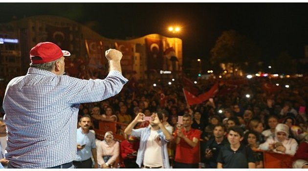 AK Parti Sakarya İl Başkanı Kılıç, “Yurtta sulh, cihanda sulh.’ Darbe girişimine koydukları isim bu. Sizin sulhunuz elinde silahı olmayan insanları, masum sivilleri öldürmek midir? Şer güçleri ardına alıp millete meydana okumak mıdır? Bu sevgiye, inanca, emeğe layık olmayı Allah bize nasip etsin. Allah sırtımızı yere getirmesin. Darbecilere fırsat vermesin. Hep beraber buradayız. İki gündür kesintisiz buradayız. Her siyasi partiden, her etnikten insanımız burada. Bu milletin birliği, dirliği ve demokrasinin devamlılığı için buradayız. Burada olmaya devam edeceğiz” diye konuştu.