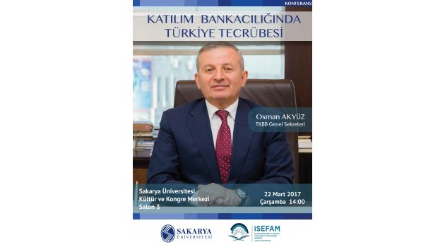 Sakarya Üniversitesi İslam Ekonomisi ve Finansı Uygulama ve Araştırma Merkezi (İSEFAM) tarafından“Katılım Bankacılığında Türkiye Tecrübesi” konulu bir konferans düzenlenecek.SAÜ Kültür ve Kongre Merkezi’nde yapılacak konferansa konuşmacı olarak Türkiye Katılım Bankaları Birliği (TKBB) Sekreteri Osman Akyüz katılacak. Konferans, 22 Mart Çarşamba günü Salon 3’de saat 14:00’de başlayacak.